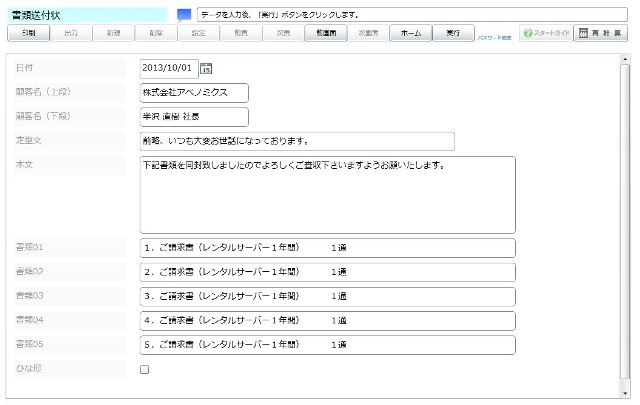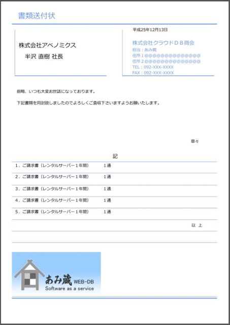 一般にはワープロで作成しているだけの場合が多い書類送付状ですが、あみ蔵を利用することにより、事前に「ひな形」を作成して、後はコピーするだけで簡単に作成することができます。